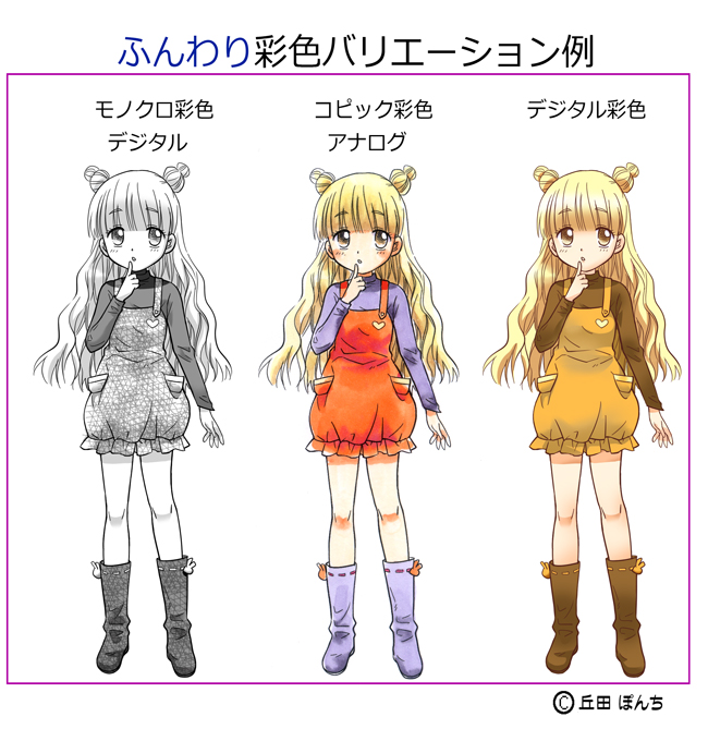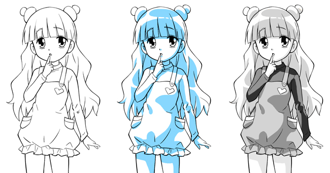 最初に影があれば、アニメ風でもマンガ風でも、あとは髪の毛や服の色などを決めることでモノクロもカラーイラストもできます。