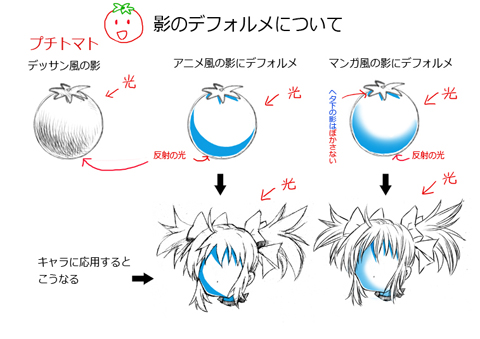 アニメ風は光と影の境界線をはっきりと描き、マンガ風の影はモノがモノにおとす影(トマトにおちるヘタの影)だけ、はっきりと描いて、その他の影(陰)は境目をぼかして描く……。考え方はこんな感じですね。