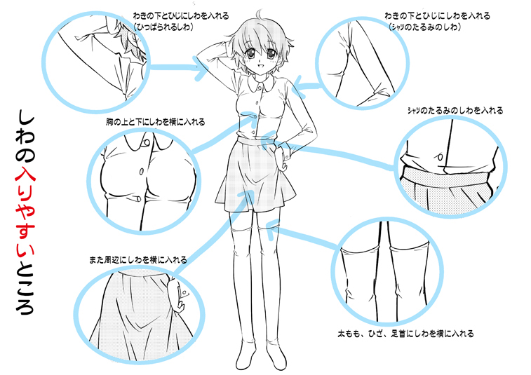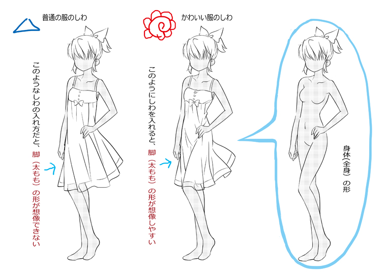 服のしわの描き方、かわいらしく服を描くコツは、身体の形が想像できるように描くことです(^○^)