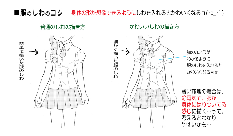 今度は胸の周辺のしわをよく見て比べてください。服が部分的に身体にはりついているように描くとかわいく見えますョ(*´ω`*)
