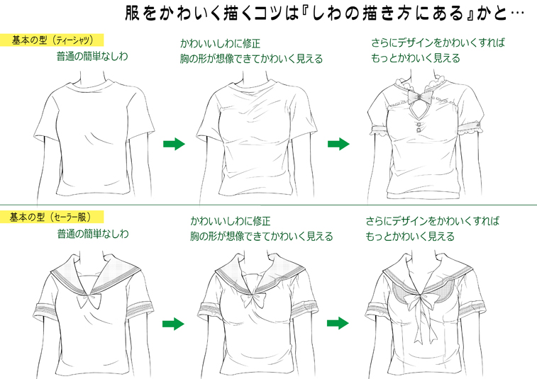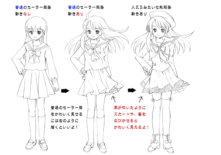そのまえにまずは、かわいく服を描くためのコツを覚えましょう☆普通のセーラー服であっても、ちょっとした一工夫でかわいく見せられます。