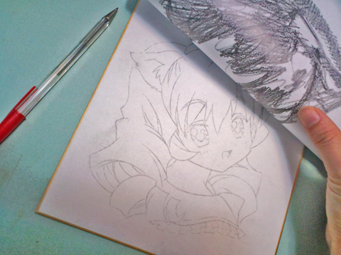 直接色紙に下描きを描くコツは、とにかく線を薄く描く事です。そうすると間違えても消しやすいですし、汚れにくくなるかと思います。