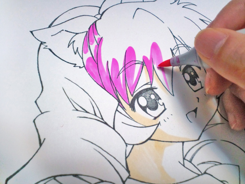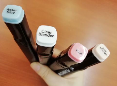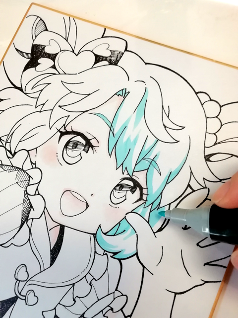 通常のぼかし塗りは色を塗る前にクリアブレンダー(透明色)を先に塗る場合が多いかと思いますが、色紙の場合はマーカーの渇きが早いので、先にパールオレンジ(薄いピンク色)を塗ってからクリアブレンダーでぼかす方がオススメです。顔はお化粧するような感じで塗っていくといいでしょう。
