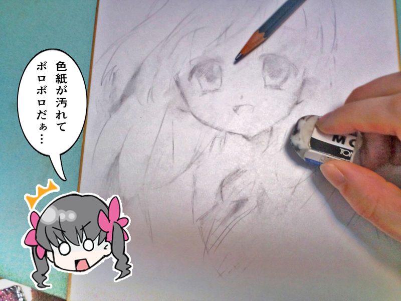 色紙にえんぴつやシャーペンで下描きを描いて、消しゴムで何回も消したりしていると、だんだん紙がボロボロになってしまったり、黒ずんでしまったりすることもありますよね。