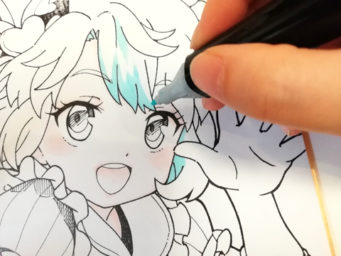 髪の毛はウォーターブルー(水色)で塗っていきます。ここでも全体に塗らずに髪の毛が光っている部分を塗り残しながら、立体的に見えるように塗っていきます。