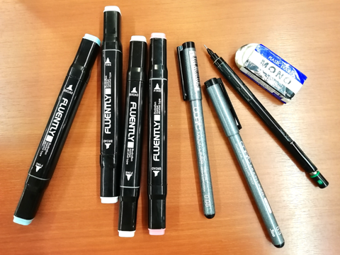 今回、描くのに使う道具の紹介をします!左から色を塗るためのイラストマーカーが4本、コピックライナー、シャーペンと消しゴムです。…これだけです。色紙に描いたキャラ絵を少ない色数で、簡単でかわいく塗ってみたいと思います!
